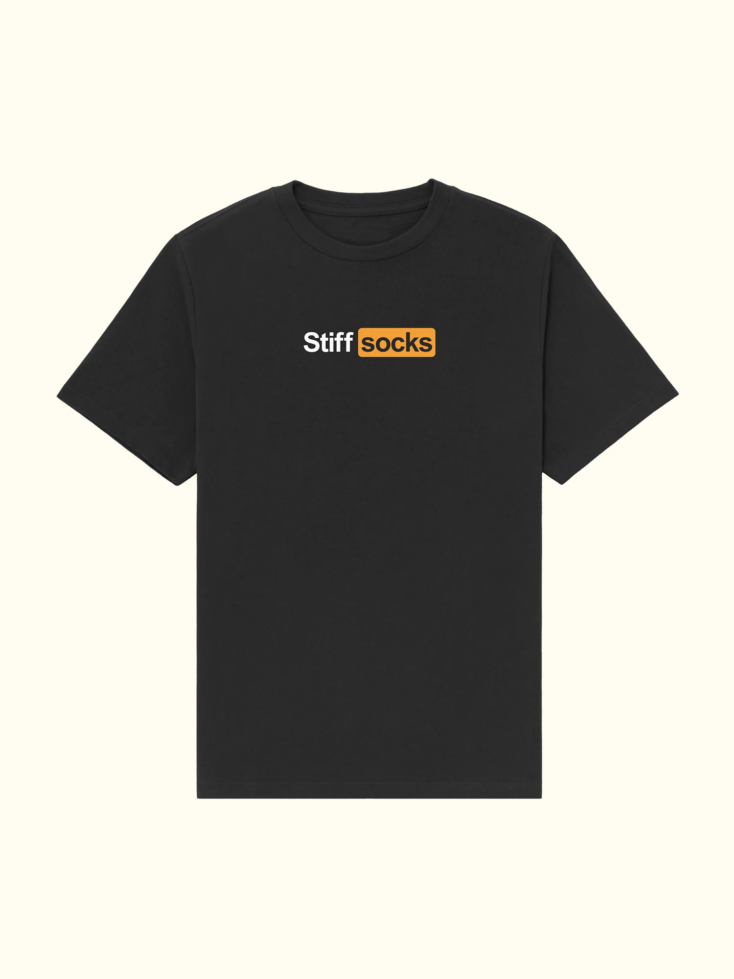 High quality black t-shirt with the "Stiff Socks" premium design in the center.